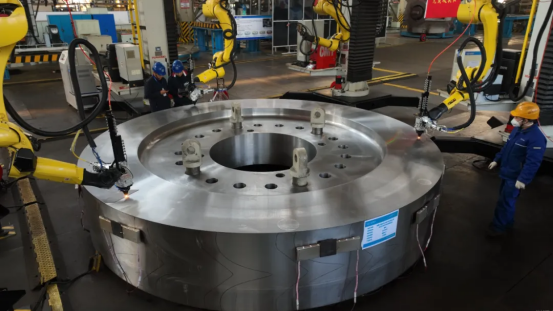 为应对冲击式机组运行的复杂工况,提高转轮焊接质量,918博天堂电机积极探索自动化、智能化焊接技术,通过三维模拟、工装设计,克服了强约束空间焊接干涉难题,实现了狭小空间内机器人轨迹规划。通过大量焊接试验,形成了冲击式转轮焊接数据库,开发了专用离线编程软件,实现了大幅度截面变化的焊道排布、多曲面变化的焊缝成型。此外,还采用了5G网络多机器人集成控制技术,实现了智能传感、动态纠偏,提高了焊接效率和稳定性;采用数字孪生技术,实现焊接过程远程监控。
